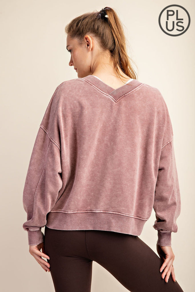 Crafted from mineral washed French terry fabric, features a relaxed fit with a mid-length cut. The V-neckline at both the front and back adds a chic touch, while the ribbed details at the neck, cuffs, and hem enhance its cozy appeal. Perfect for any casual occasion, this pullover combines fashion and ease in one versatile piece.
