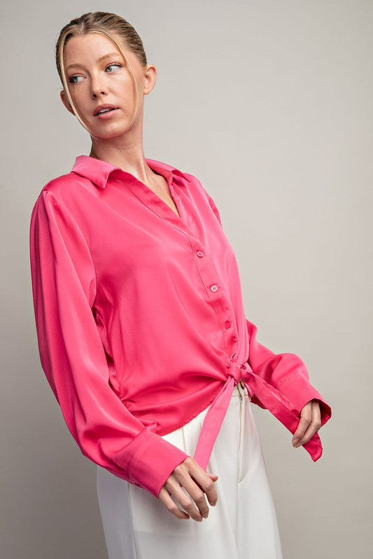 Long sleeve button down shirt featuring a front tie, a collared neckline and pinched side detail.