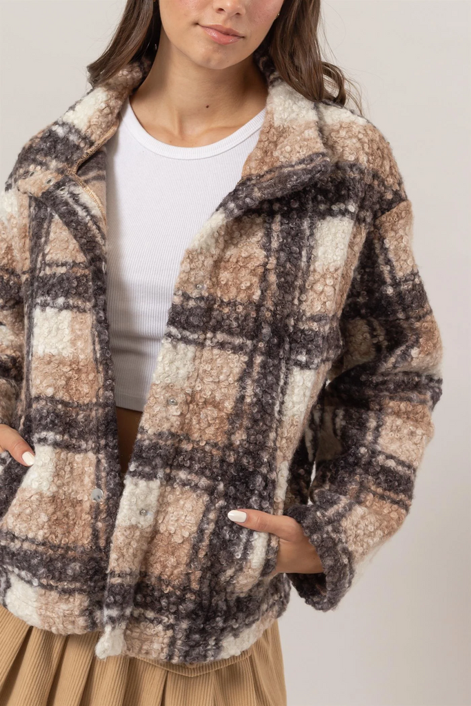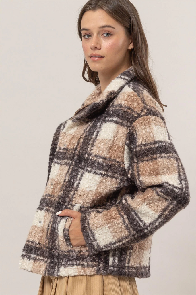 Made From A Plaid Boucle For An Effortlessly Chic Look And Comes With A Stand Collar. The Relaxed Bodice Boasts Button Fastenings Down The Front And Side Pockets To Keep Your Hands Toasty.